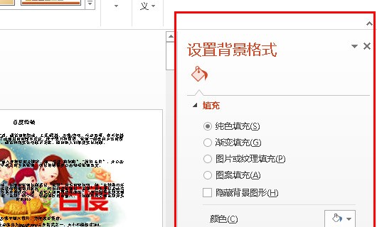 6、在右边的“设置背景格式”中的填充下面点击选择“纯色填充”没点击后,马上就可以看到背景图片没有了。