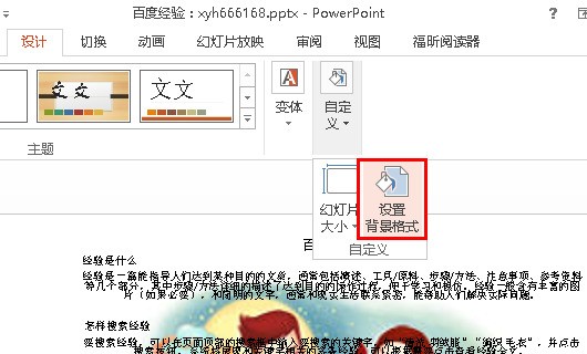 3、点击自定义后,就打开自定义的子菜单,在子菜单工具中选择“设置背景格式”。