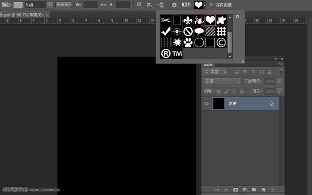 2、选择自定义形状工具,选择心形。在舞台绘制