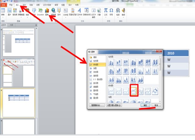 3、可以直接点击“插入”——找到“图表“并点击,界面弹出图表,点击”折线图“,选择折线图类型,点击”确定“,随后右侧弹出excle的电子表格,在电子表格内输入或修改表格内容,自动同步到ppt中