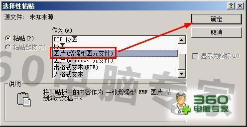 打开了选来自择性粘贴对话框,我们选择【图片(增强型图元文件)】,然后点击确定按钮,这样就可以将文字转化为格式了。