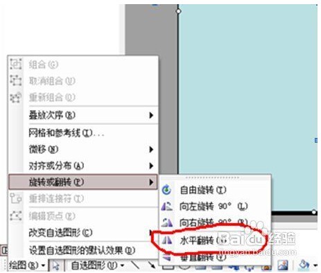 2、按住健盘上的"ctrl”键,拉(复制粘贴)出一个相同的图形,并排摆放于第一个图形的左面,然后点击“绘图”右边的小三角,选择“旋转或翻转”——“水平翻转”。