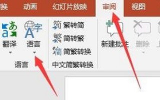 1、点击导航栏中的审阅,然后可以看到下面有一个语言功能,就是在这里进行设置的,能为PPT中的语言设置成英文,因此直接点击这里就能进行选择了。