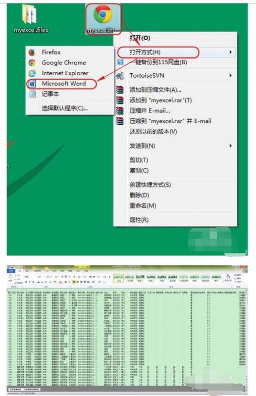 3、找到刚刚将Excel文档另存为的Html文档,选中后,点击“右键 | 打开方式 | Microsof Word ”,Html文档在Word中的样式如下图所示