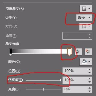 3、中心填充为黑色(根据需要调整透明度),边缘填充为背景色并调整透明度为100%(比如我的截图背景色是白色)
