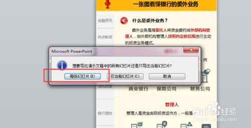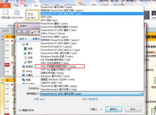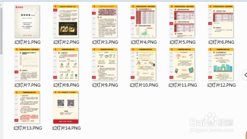 做完后的PPT先保存一份,然后再选择【文件】—【另存为】,选择可移植网络图片格式PNG格式,弹出对话框选择【每张幻灯片】;电脑会自动帮你把每一页PPT转化成为图片并且按照顺序排列好在一个文件夹内。