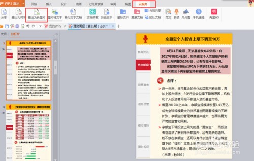打开WPS版本的PPT,还是跟上面一样按照正常制作PPT的步骤完成内容的制作。然后点击顶部导航栏的【云服务】—【输出为长图片】,直接即可生成长图。但是这个有个不好的地方,如果不是WPS会员,生成的长图会有WPS的水印,但是不影响阅读。但是这种方法做出来的长图清晰度要比美图秀秀拼图的方法要高。
