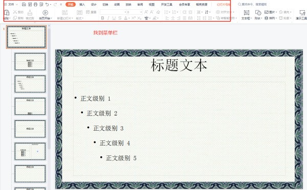 1、首先在ppt界面,可以在页面上方找到菜单栏,如下图所示。