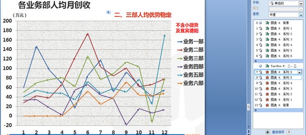 现在的问题是在右侧自定义动画的窗口中,我无法把系列1退出这条动画拉到系列6退出的前面,也就是说PPT一定要系列6先退出后,系列4才能退出,然后系列3,系列2,系列1.