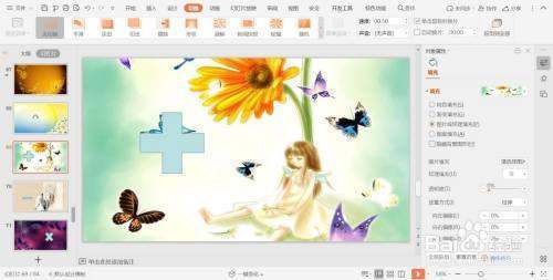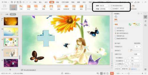 在【切换】子菜单栏中设置速度、声音、自动换片等切换效果的参数。