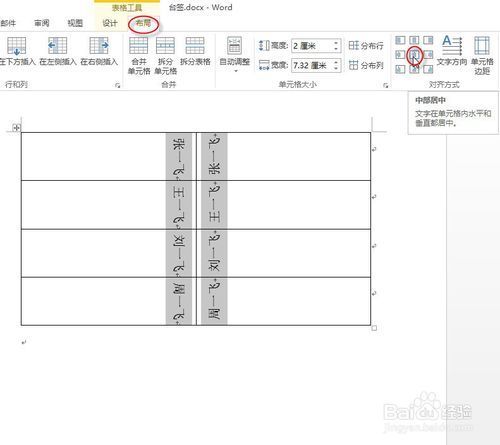 全选表格,在[表格工具]/[布局]/[对齐方式]组中单击“中部居中”按钮