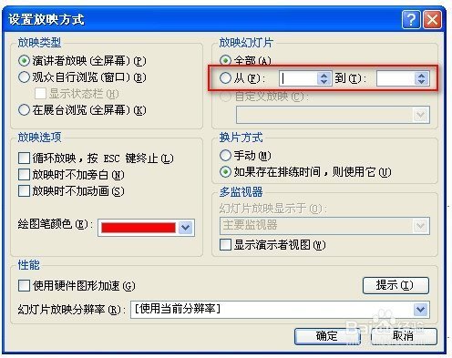 4、这里我们需要把“放映幻灯片”改为“全部”,点确定保存设置。这样就可以了。