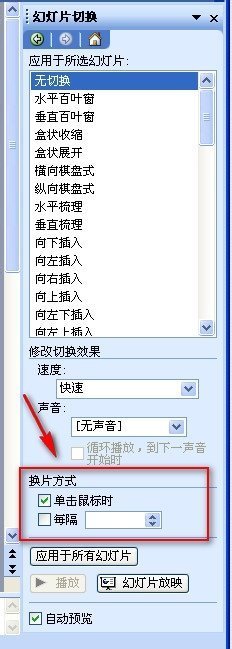 2、 在右侧的幻灯片切换选项里,查看一下换来自片方式中的“单击鼠标时”前的勾有没有取消掉。