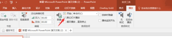 2、在工具栏上的“播放”下勾选“跨幻灯片播放”。