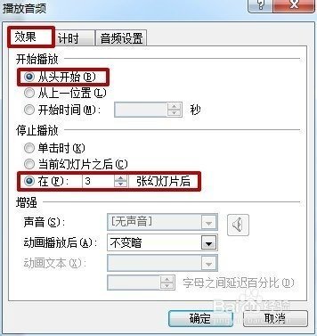 6.在弹出的“播放音频”选项卡里,“效果”选项框中的“开始播放”选择“从头开始”,“停止播放”选择“在3张幻灯片后”。