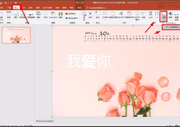 8、然后再次点击工具栏上的【插入】-点击【视频】-点击【pc上的视频】
