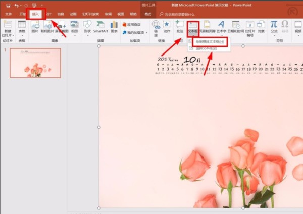 4、背景图片插入后,点击工具栏上的【插入】-点击【文本框】-点击【绘制横排文字文本框】