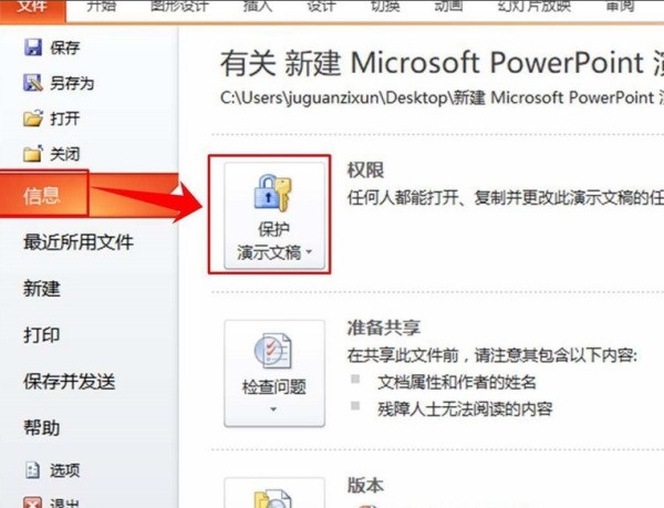 2、点击保护演示文稿进入文件页面后,在左侧的菜单栏中选择【信息】,然后在右侧的内容页面中点击选择【保护演示文稿】。