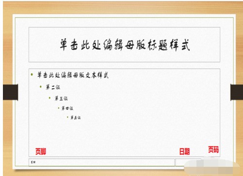 1、默认页脚的位置和来自样式,点击视图-幻灯片模板,可以看出PPT默认页脚的位置和样式如图所示。