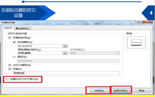 4、页眉和页脚的其它设置。如图,标题幻灯片中不显示——表示标题幻灯片中没有页眉和页脚,应用——表示只应用与当前幻灯片,全部应用——表示运用于全部幻灯片。