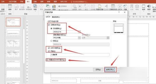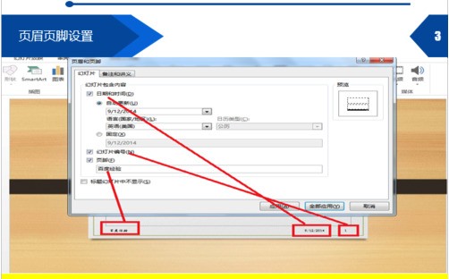 3、页眉页脚设置。如图可以进行页眉页脚设置,页脚可以任意输入你所需要内容,幻灯片编号是页码。
