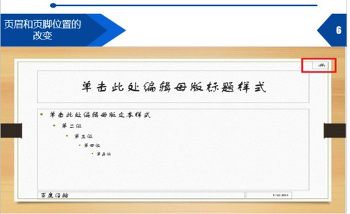 6、页眉和页脚位置的改变。如图,在幻灯片母版中拖动页眉页脚的位置,就能统一改变页眉页脚的位置,效果如图所示。