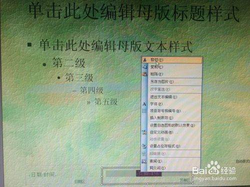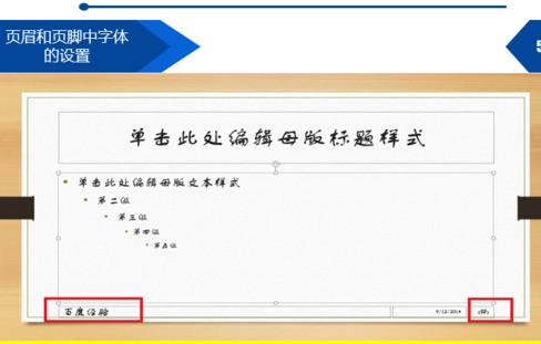 5、页眉和页脚中字体的设置。如果觉得页眉和页脚的字体,颜色不合适,这时一定要在幻灯片模板中修改,就能对页眉页脚字体进行统一修改。