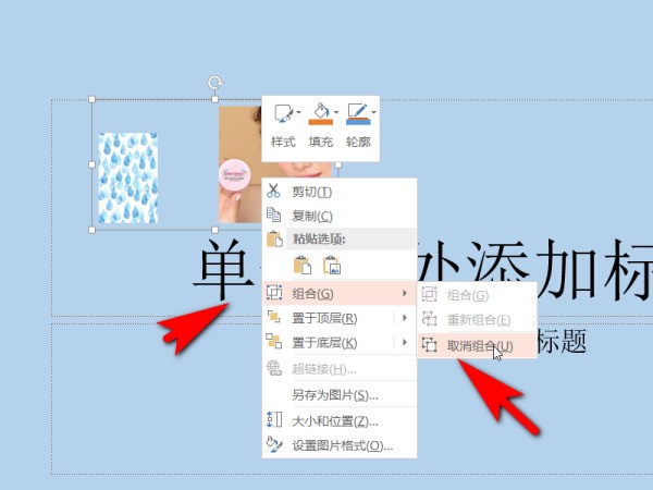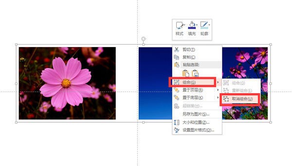 3、我们将两个图片选中,然后单击鼠标右键,选择组合把两张图片组合在一起,然后来进行以下将图片分开的操作,同理,点击组合在一起的图片,单击鼠标右键,选择工具栏中的组合工具,然后选择取消组合即可。