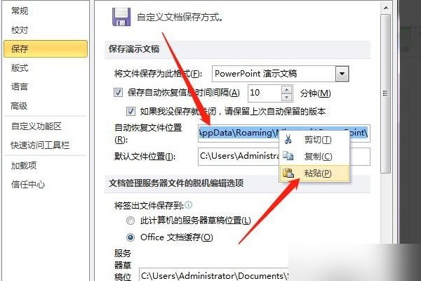 5、回到PowerPoint选项设置对话框,选中“自动恢复文件位置”后文本框中内容,右击,点击粘贴,按确定,PPT自动保存设置完成。