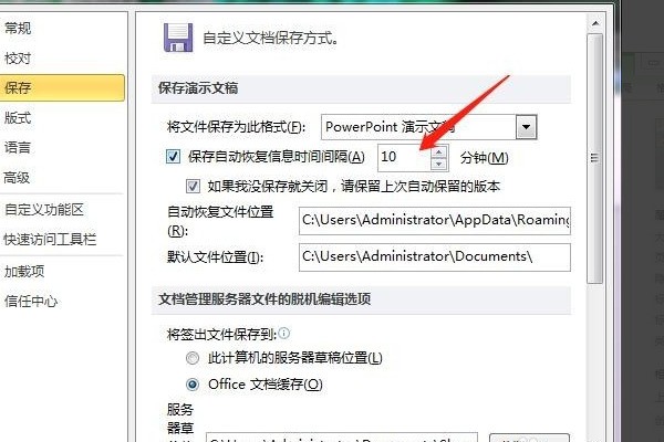 3、在右侧“保存自动恢复信息时间间隔”后面文本框中输入自动保存的时间间隔。
