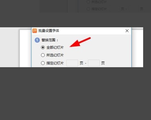 4、点击选择【替换范围】,选择【全部幻灯片】就可以进行全部字体的替换。