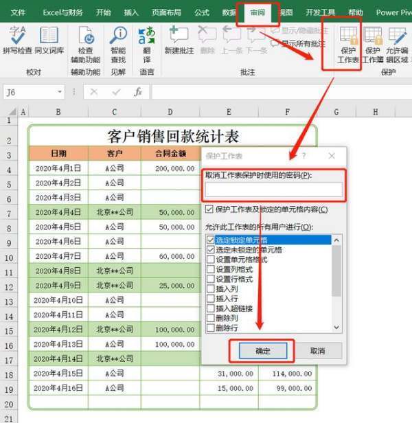 如果表格需要多人合作填充数据,每个人只允许修改自己需要填充的内容,可以分别设置密码,比如情况二中合同金额需要销售人员填写、已付款需要财务人员填写,把合同金额内容设置密码为1,已付款内容限句系首阻训代水的红为2,只有输入正确的密打应头建朝越蒸写式课码才能修改相应内容
