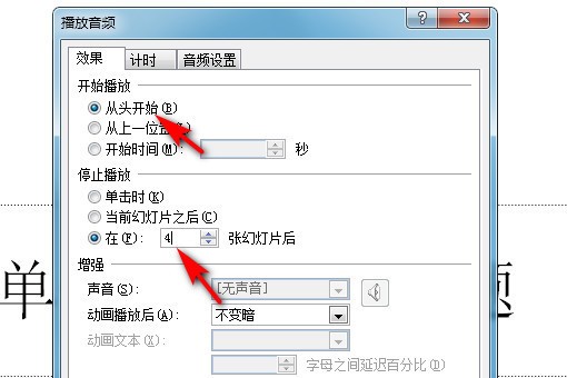 10、在效果中选择开始播放是从头开始,停止播放选择最后一张的页码,如下图所示: