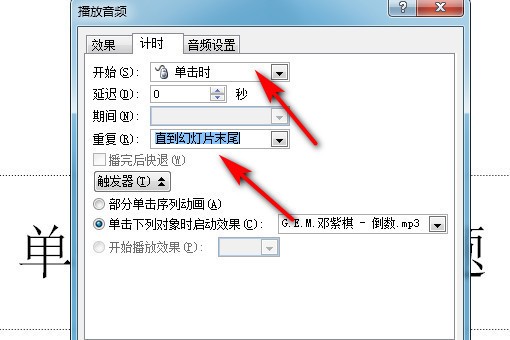 11、在选择第二项的计时,选择开始是单击时开始,重复改成直到幻灯片末尾,即可完成,点击确定,如下图所示: