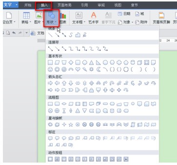2.在这里用插入图形来做实例,点击“形状”,如下图所示选择自己想要插入的图形。