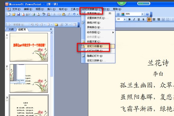 如果是在放映的时候希望强调一部分文字的话,那这一部分文字必须是单独的文本框,然后单独对这个文本框设置强调动画,步骤是: