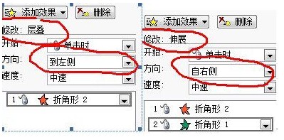 2、选中左面的图形,添加动画。在添加效果中选择“进入”——“伸展”。“开始”选择“之后”,“方向”选择“自右侧”。再选中左面的图形,再给它一个效果”进入---渐变,“开始”选择“之前”。