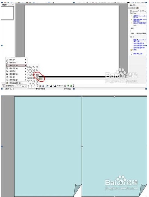 1、点击“自选图形”右边的小三角,选择“基本图形”下的“折展角形”图形,在PowerPoint中画出一个书页样的图形,宽度最好小于文档的一半。