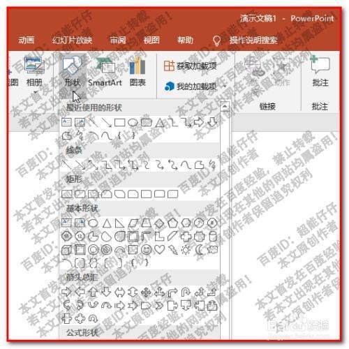点插入菜单,选择插入图形,在众多形状中,选择目标形状,我在这里以一个矩形为例供。