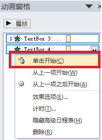 4、在“动画窗格”面板中找到已添加的两个动画, Ctrl+A全部选中,然后点击后面的下拉箭头选择“单击开始”。