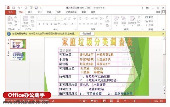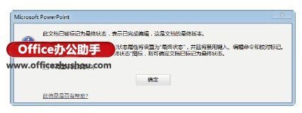 2、此时PowerPoint将提示文档被标记为最终版本后进行保存,如图2所示;单击“确定”按钮后,P状在露官日owerPoint弹出提示对话框提示文档当前的状态,如图3所示,单击“确第燃列波点应定”按钮。该文档被打开后,功能区下方会提示文档被标记为最终状态,功能区中的编辑命令不可用,如图4示。如果需要对文档进行编辑,只需要单击功能区下方出现的提示栏中的“仍然编辑”按钮即可。