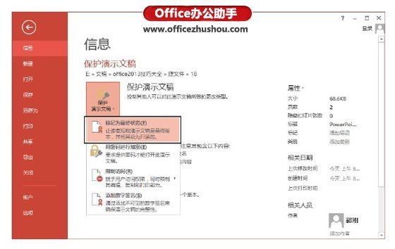 1、启动PowerPoint 2013并打开需要保护的文档。在“文件”窗口左侧列表中选择“信息”选项,在中间窗格中单击“保护演示文稿”按钮,在打开的列表中选择“标记为最终状态”选项,如图1所示。