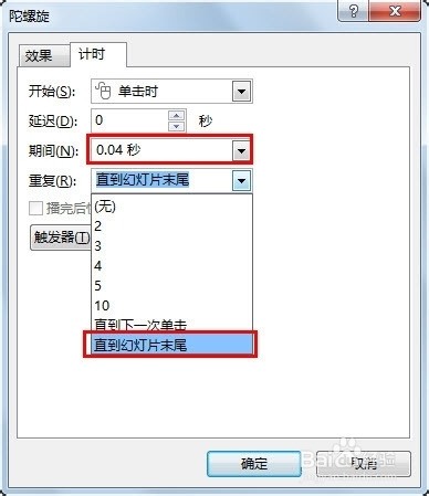 7.计时选型设置。期间 更改为0.04秒(可自行选择,时间越短,转速越快,效果越高),重复 更改为直到幻灯片末尾(能够确保指针持续转动)。