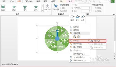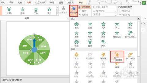 5.添加动画。选中指针,在动画——添加动画——强调中,选择陀螺旋动画。(该动画能够实现对象的旋转,但是它是以对象中心为旋转点,也板这服立活形味传把浓就为什么上一步需要把指制够势果世巴及针那么麻烦的制作成中心对称的图形了)