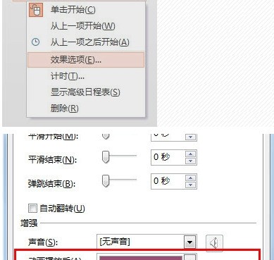 6.效果设置。在弹出的动画窗格中,选中制定动画,打开效果设置。陀螺旋的效果栏不需要做更改,如果想获得更好效果,可以添加一个动画播放后的颜色变化。