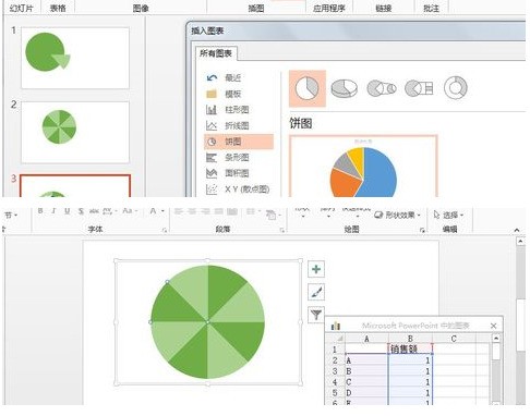 2.借助扇形图制作表盘。插入——图表——饼图,通过调节数据使得区域增加,同时保持值相等,这样就能轻松实现圆的等分。完成后,对扇形图进行格式颜色的修改(去除边框,调节单块扇形的颜色)