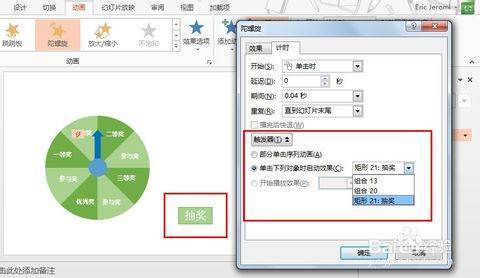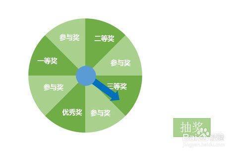 9.检查,实现抽奖。播放幻灯片,查看效果,点击按钮开始,再次点击停止转动。这样就轻松实现了抽奖。如果旋转过程指针晃动严重,只需要再次调节指针确保位于图像中心。