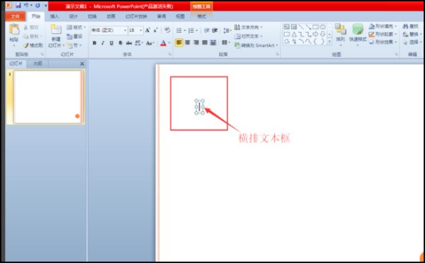 2、以插入横排文本框为例:选择“横排文本框”,将鼠标移至PPT设计页面处,当鼠标变成“+”,单击鼠标左键,此时PPT设计页面上将会出现横排文本框。