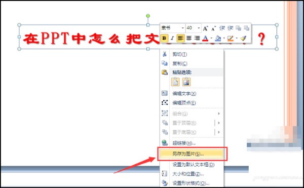 4、选中做好的文本框,单击鼠标右键,此时将会弹出对话框。选择对话框中的“另存为图片”图标,在弹出的对话框中给需要保存成图片的文本框命名并保存,这样ppt转化文字就成功了。