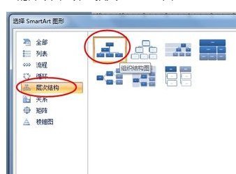 2、在弹出的“选择SmartArt图形”窗口上,选择“层次结构”。